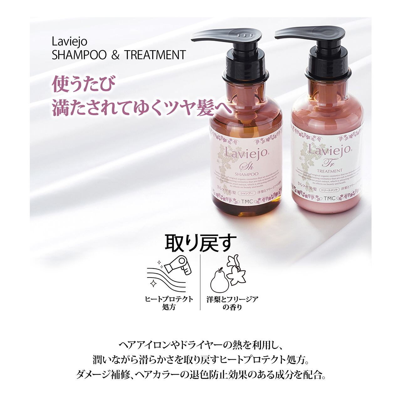 ヘアアイロンやドライヤーの熱を利用し、潤いながら滑らかさを取り戻すヒートプロテクト処方。